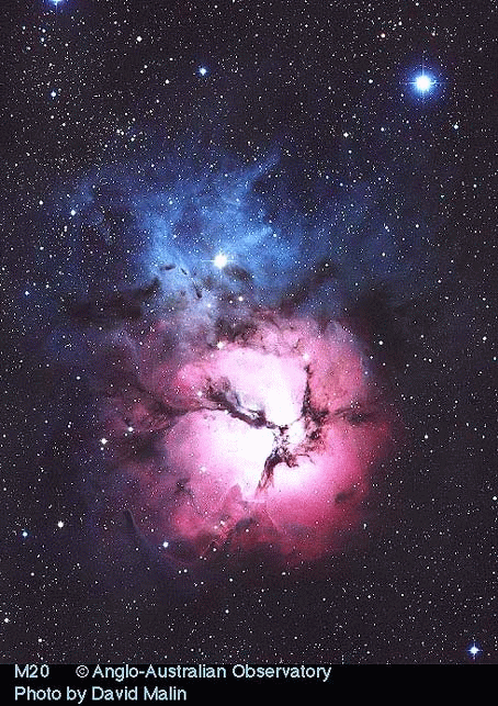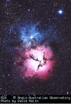 In this AAT photograph the red emission and blue reflection nebula parts of the Trifid Nebula are prominent. This image is a 3-color composit obtained from black and white pictures taken with different emulsions and filters.