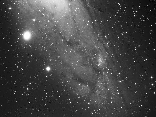Southern and southwestern part of the Andromeda Galaxy M31, showing its bright elliptical copmpanion, M32, as well as star cloud NGC 206 and interesting detail of the Great Galaxy's spiral structure. M32 is the round elliptical Galaxy at the upper left (northeast), NGC 206 is the resolved Star Cloud to the lower right (southwest). M32 is set against the large background spiral Galaxy M31, while NGC 206 is part of a spiral arm of M31.