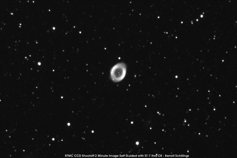 This is an image of the Ring Nebula Taken at the Riverside Telescope Makers Conference for the CCD Shootoff. It is a 2 minute image, self guided with an ST-7.
