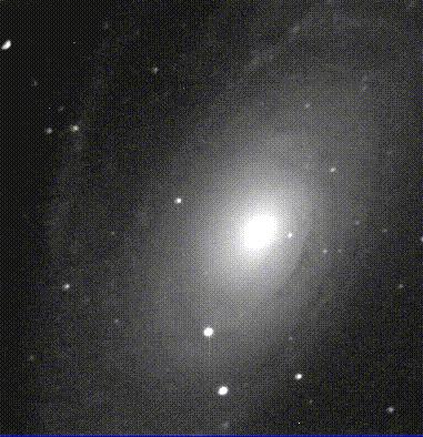 The nearby bright spiral galaxy M 81, shown in a V-band CCD image taken with the 1.1-meter Hall telescope at Lowell Observatory. A logarithmic intensity mapping has been used to preserve detail over the wide dynamic range of this image, which covers a field 9..4 arcminutes square thanks to a focal reducer.